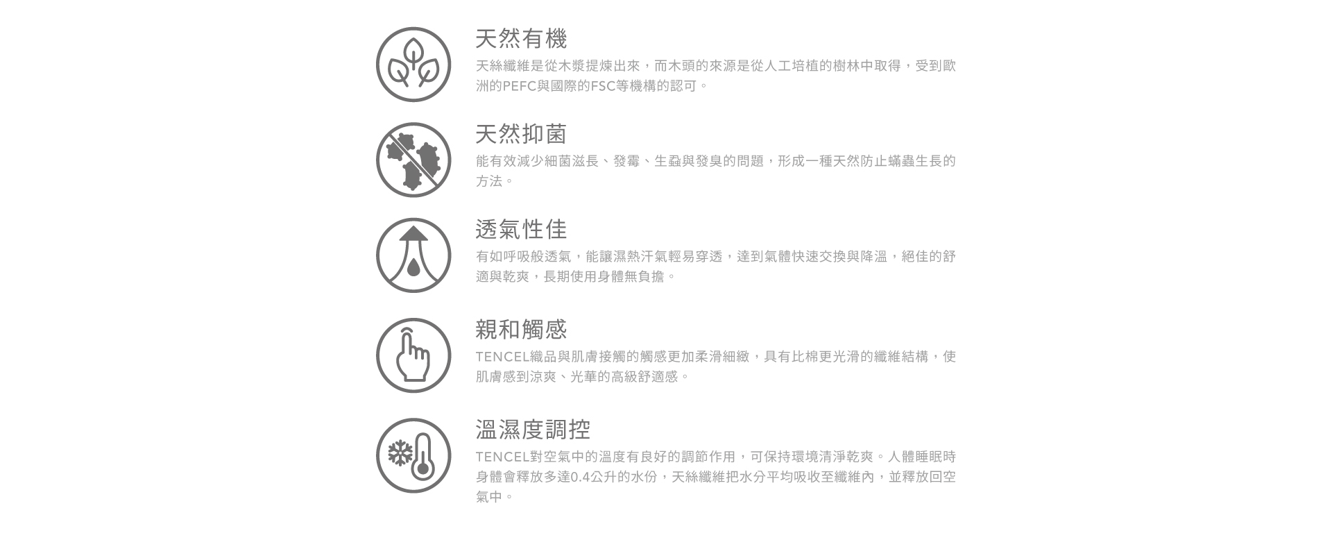 而木漿的來源是從人工培植的樹林中取得,並受到歐洲的PEFC與國際的FSC等機構的認可,入眠使您備感舒適,具有棉的舒適性、纖維的強度、羊毛織物的美感和蠶絲的柔軟觸感,無論在乾或濕的狀態下,均極具韌性。且天絲™纖維表面是細緻光滑,可改善肌膚過敏問題。