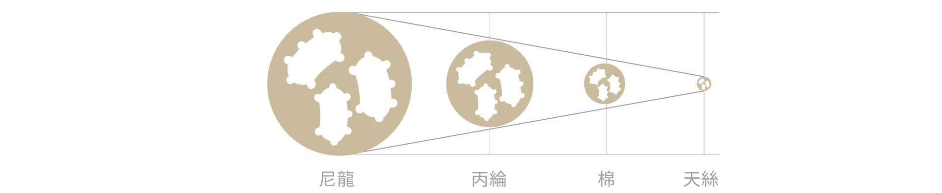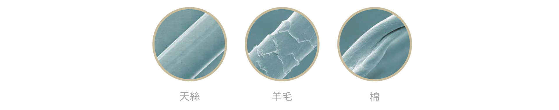 纖維整體的圓滑,圖示明顯可以看到不同纖維的表面結構,比起羊毛與棉,天絲纖™維表面最圓滑與飽滿。羊毛纖維表面如鱗狀,而棉的表面是不規則及粗糙。對於敏感性肌膚的人,天絲™是最佳選擇。光滑的纖維表面組織與絕佳的吸水性使天絲™產品更適合敏感型肌膚,創造出健康的肌膚環境。