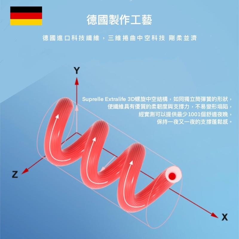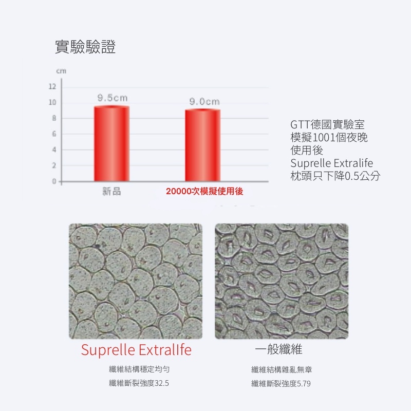 #採用德國進口Extralife系列3D捲曲纖維,依據頭型睡姿調整支撐。
