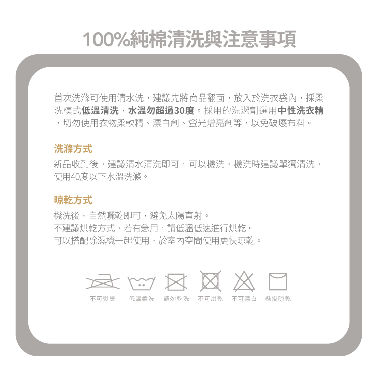 #可水洗(水溫不超過攝氏40度)/可乾洗/不可烘乾/可熨燙(溫度不超過60度)/不可漂白。